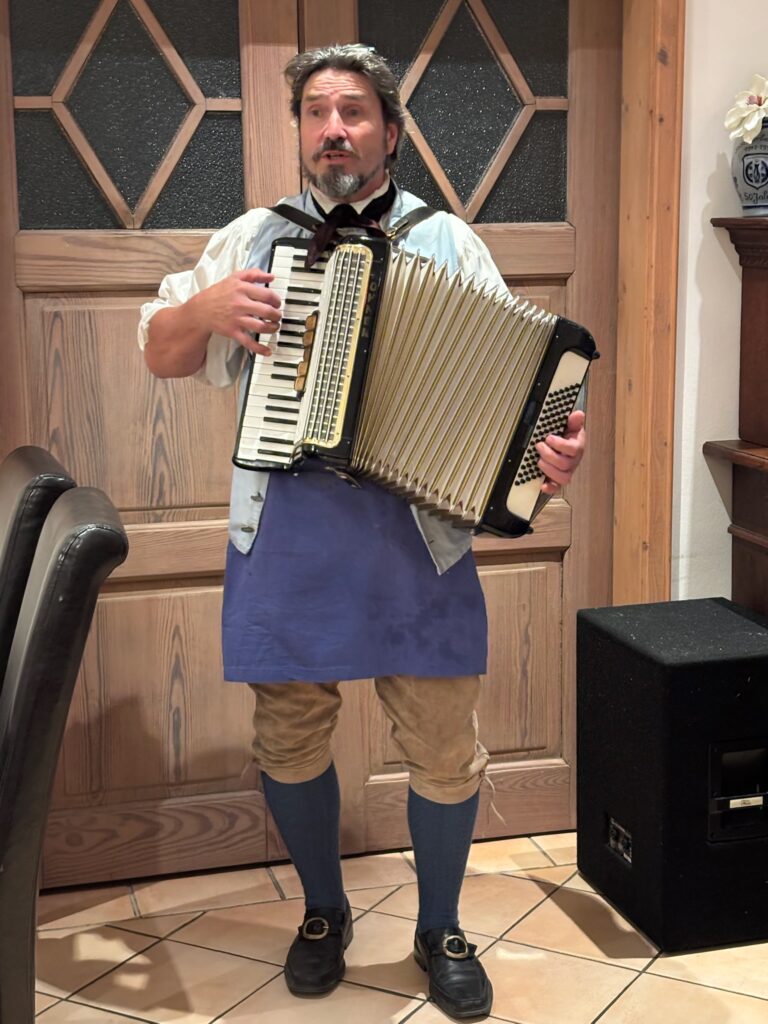 Beim leckeren Abendessen plauderte Horst-Peter Knapp auch in seiner Zweitrolle als Gastgeber munter weiter über die Historie seines Hauses und der Umgebung, zuallerletzt überraschte er die Gruppe noch mit seiner Darbietung der Orwischer Hymne „Orwischer Dippe und Ebbelwoi“ auf dem Akkordeon, bei der die Besucher begeistert mitsangen.